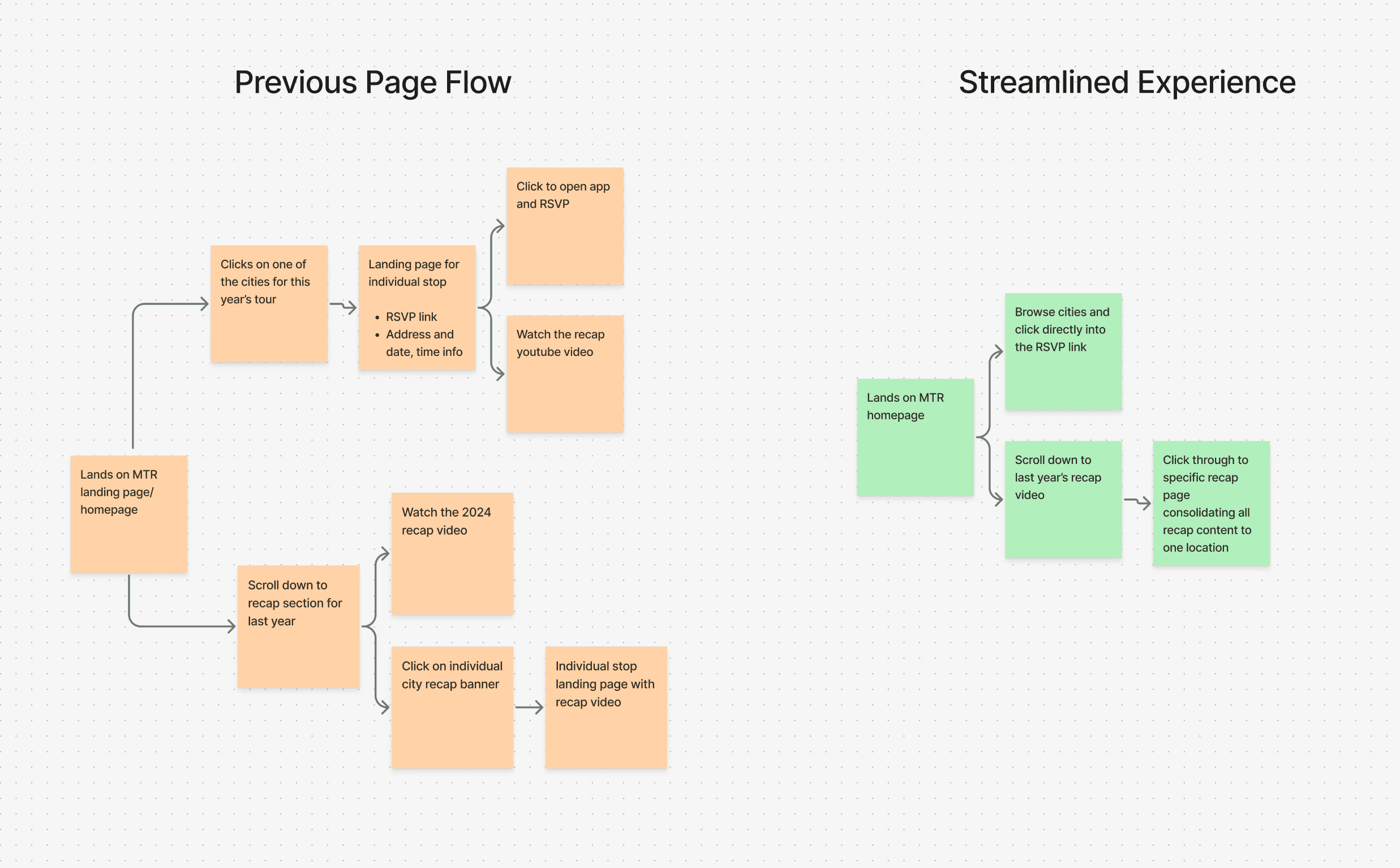 Flowchart on the right demonstrates that my design eliminated unnecessary steps, making it easier and quicker for customers to attend our events.